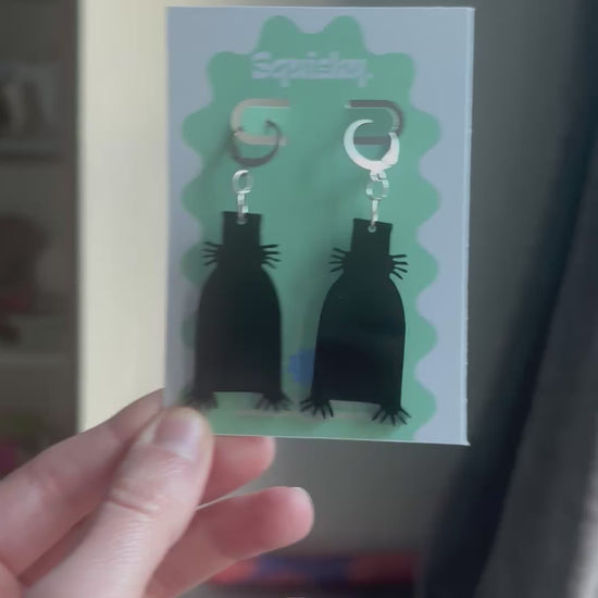 These Babadook spooky top hat silhouette earrings feature a tall, mysterious figure with sharp clawed hands, laser cut from matte black acrylic and suspended from silver huggie hoops.