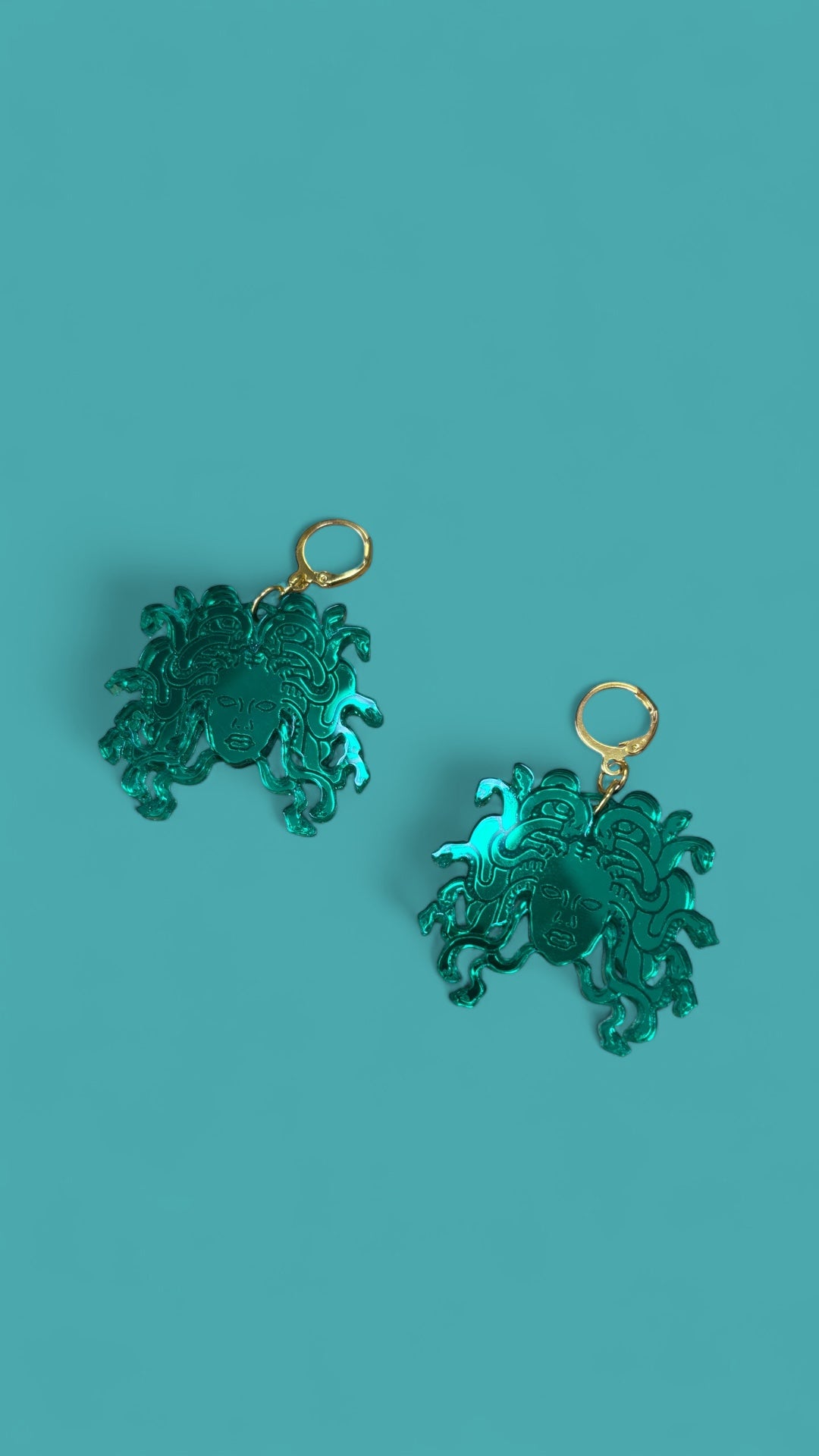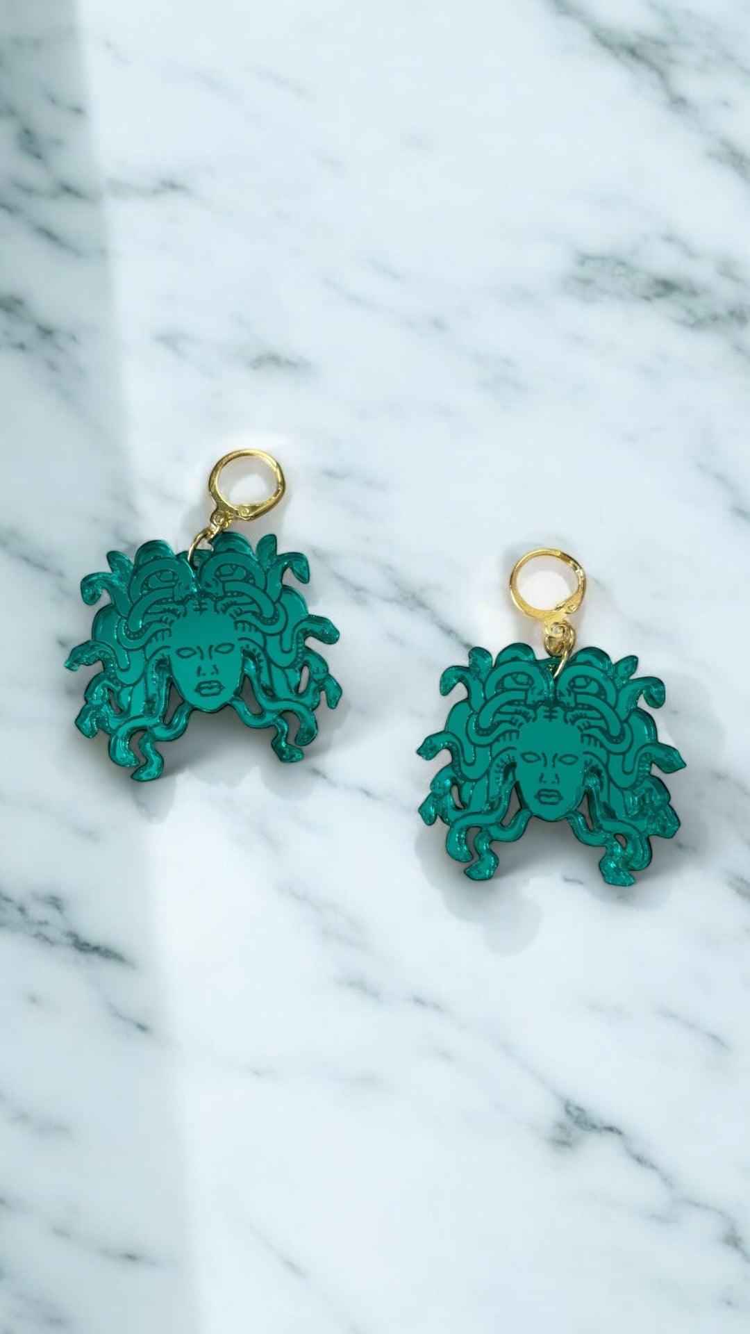 Laser-cut from mirrored emerald acrylic, each charm features an engraved Medusa face framed by writhing snake-hair details. They hang from lightweight gold-tone huggie hoops that make them easy to put on, comfy to wear, and unmistakably dramatic. Perfect for gothic wardrobes, witchy aesthetics, or anyone who wants jewellery with attitude.