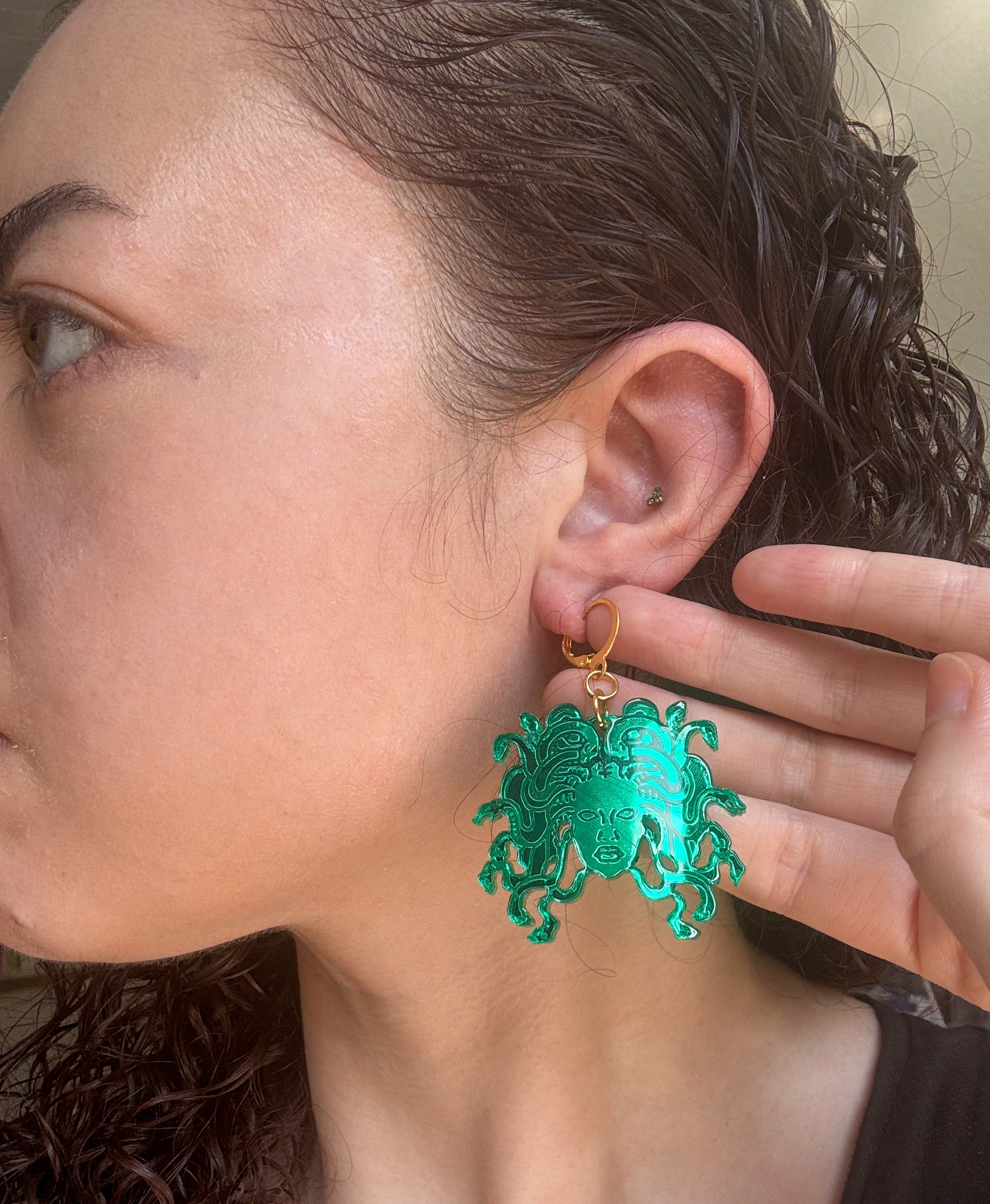 Green Medusa Earrings Mirrored Acrylic Medusa Head Hoops Mythic Statement Jewellery Goth Alt Fashion Ancient Greece, Classics Witchy Costume π