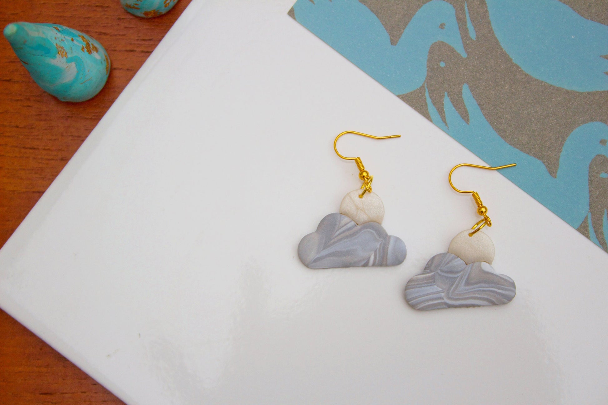 Marbled Polymer Clay Cloudy Moon Earrings Soft Gothic Crescent Statement Studs | Celestial Jewellery, Handmade Alt Accessories, Witchy Vibes
