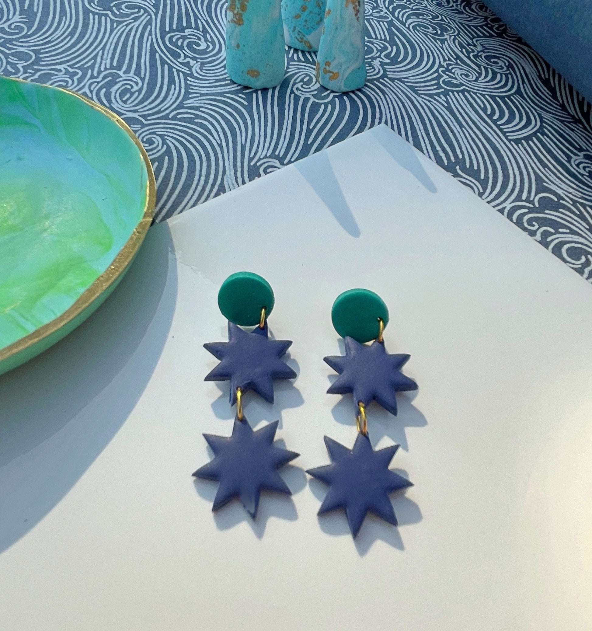 Add a bold graphic twist to your outfit with these navy and emerald green polymer clay star earrings ⭐