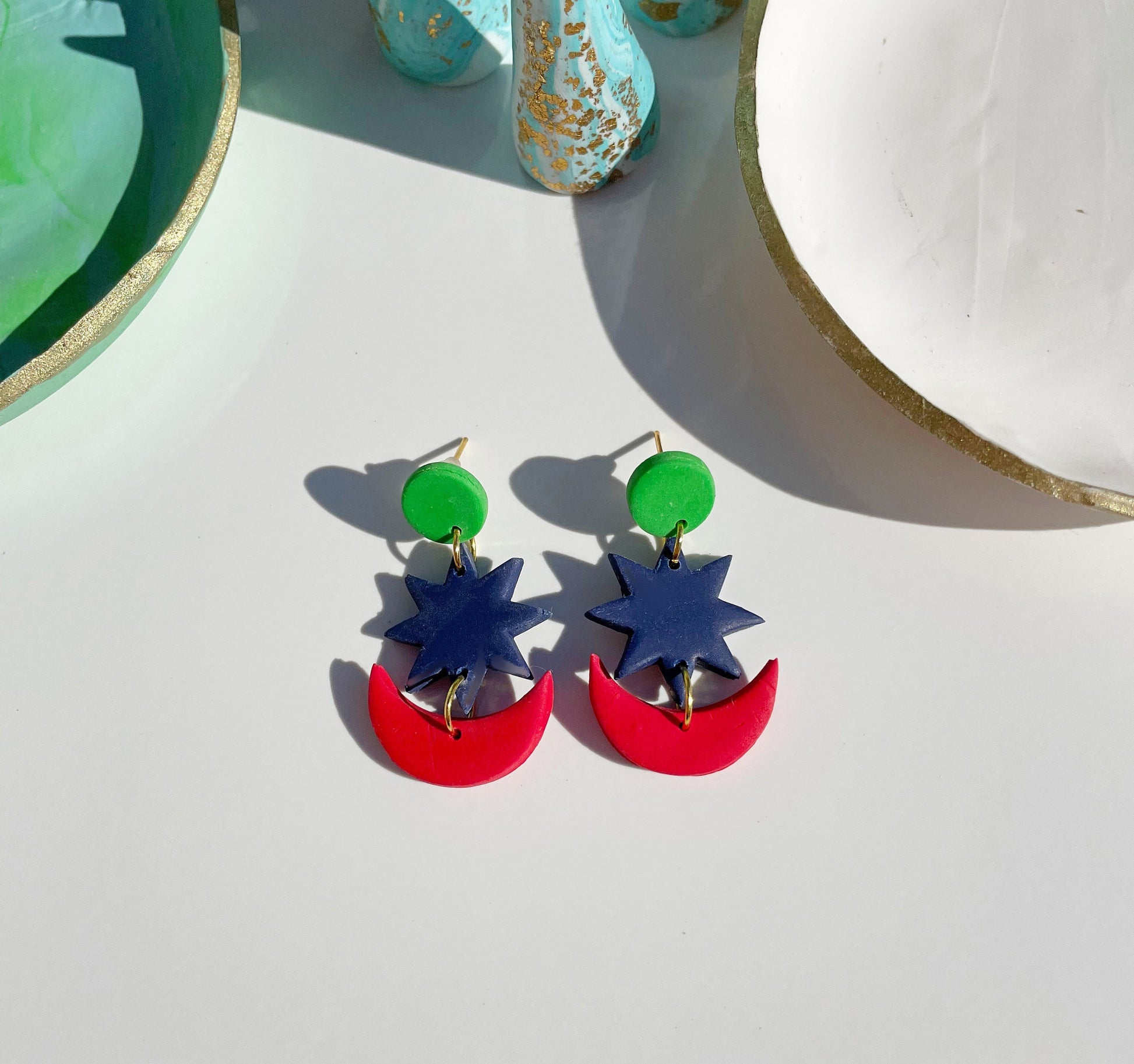 The star and crescent moon shapes give a classic cosmic feel, while the bold colours keep it playful and expressive. They're super lightweight and easy to wear, making them a great day-to-night statement piece.