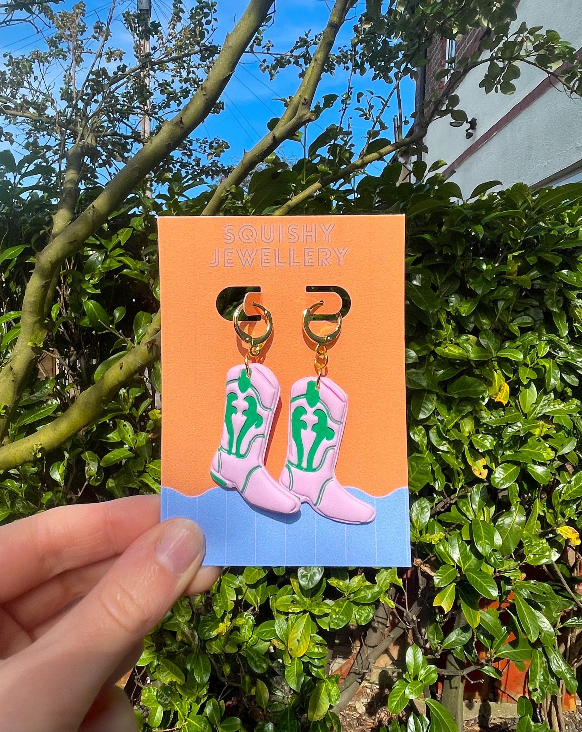 Pink & Green Cowboy Boot Retro Kitsch Western Barbie Polymer Clay Country Chappell Roan Handpainted Huggie Hoop Earrings