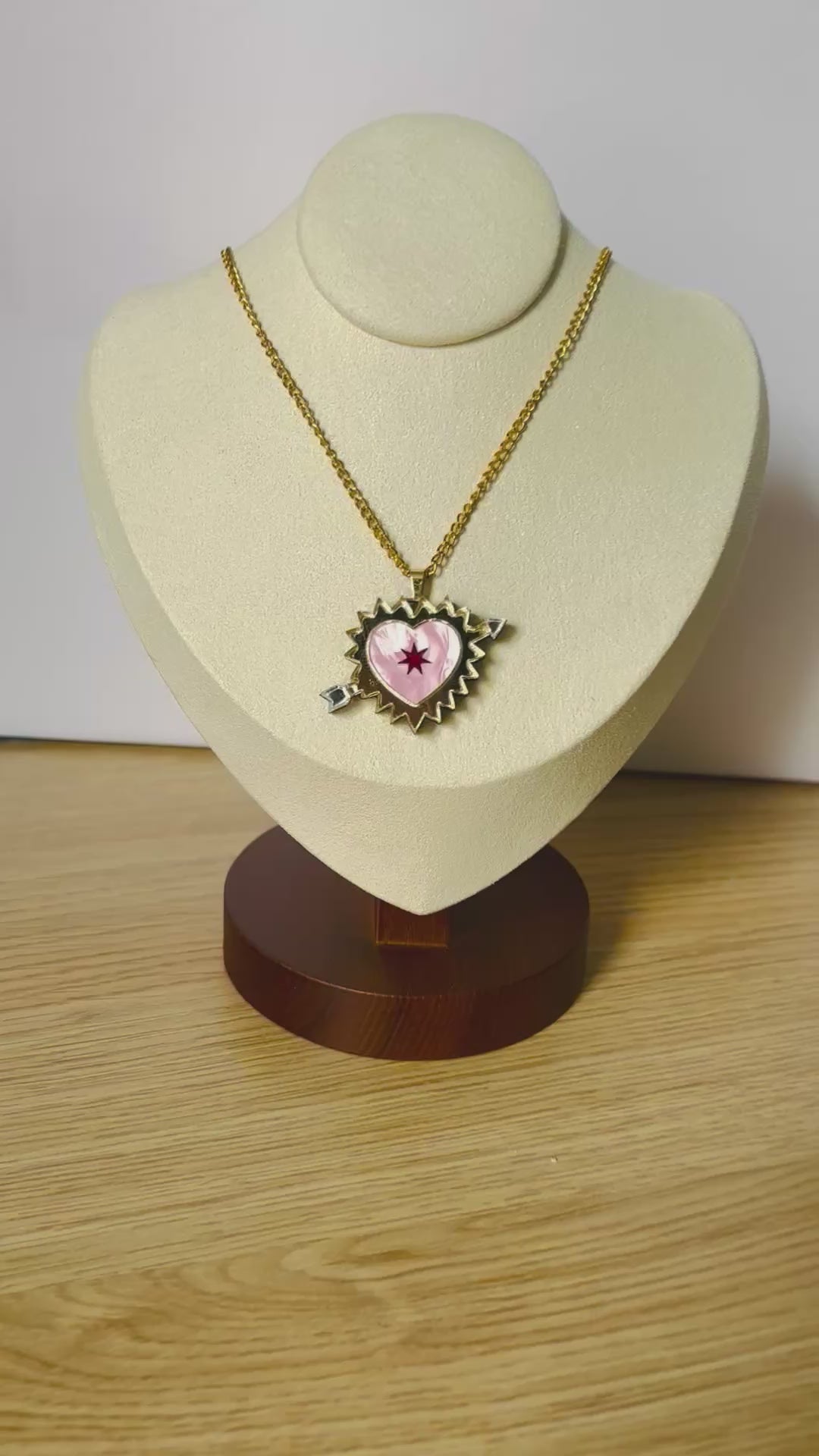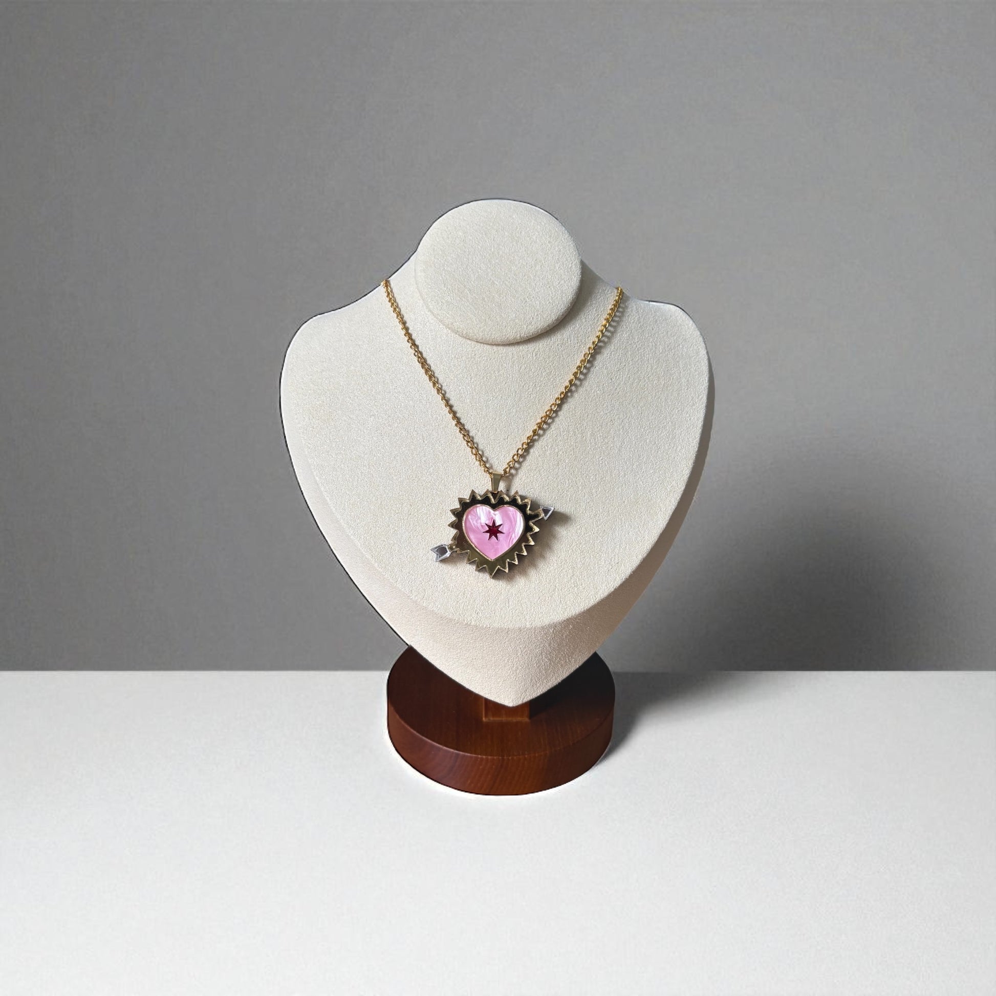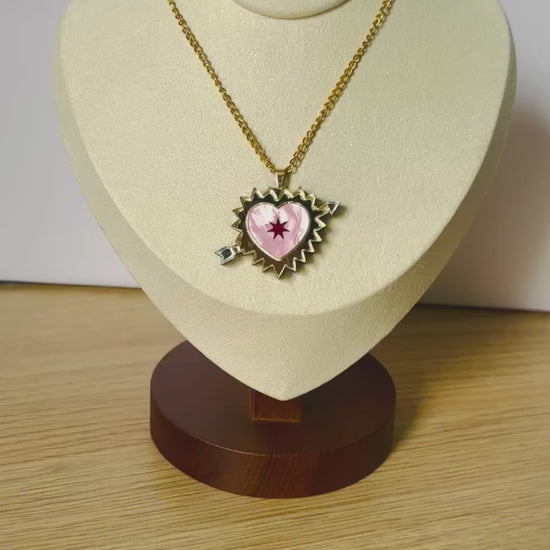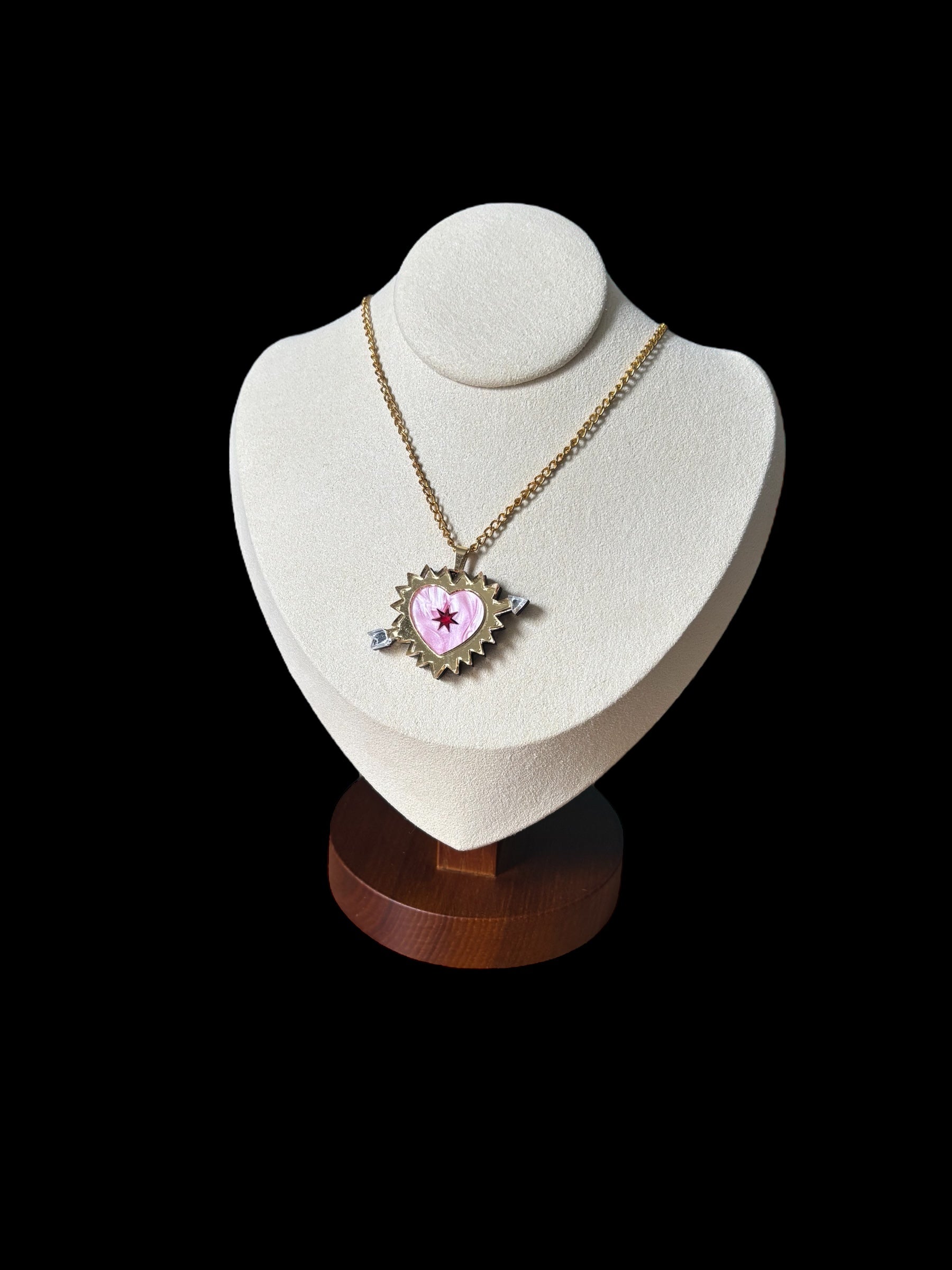 This statement necklace takes inspiration from the sacred heart motif, reimagined with a playful and modern edge πβ¨ At the centre is a pearlescent pink acrylic heart with a tiny star detail, framed by a bold gold sunburst design and pierced with a silver arrow for extra drama.