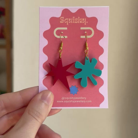 Red and Blue Kiki Bouba Earrings Linguistics Inspired Abstract Acrylic Cognitive Science Jewelry Mismatched Statement Gifts Memphis Milano