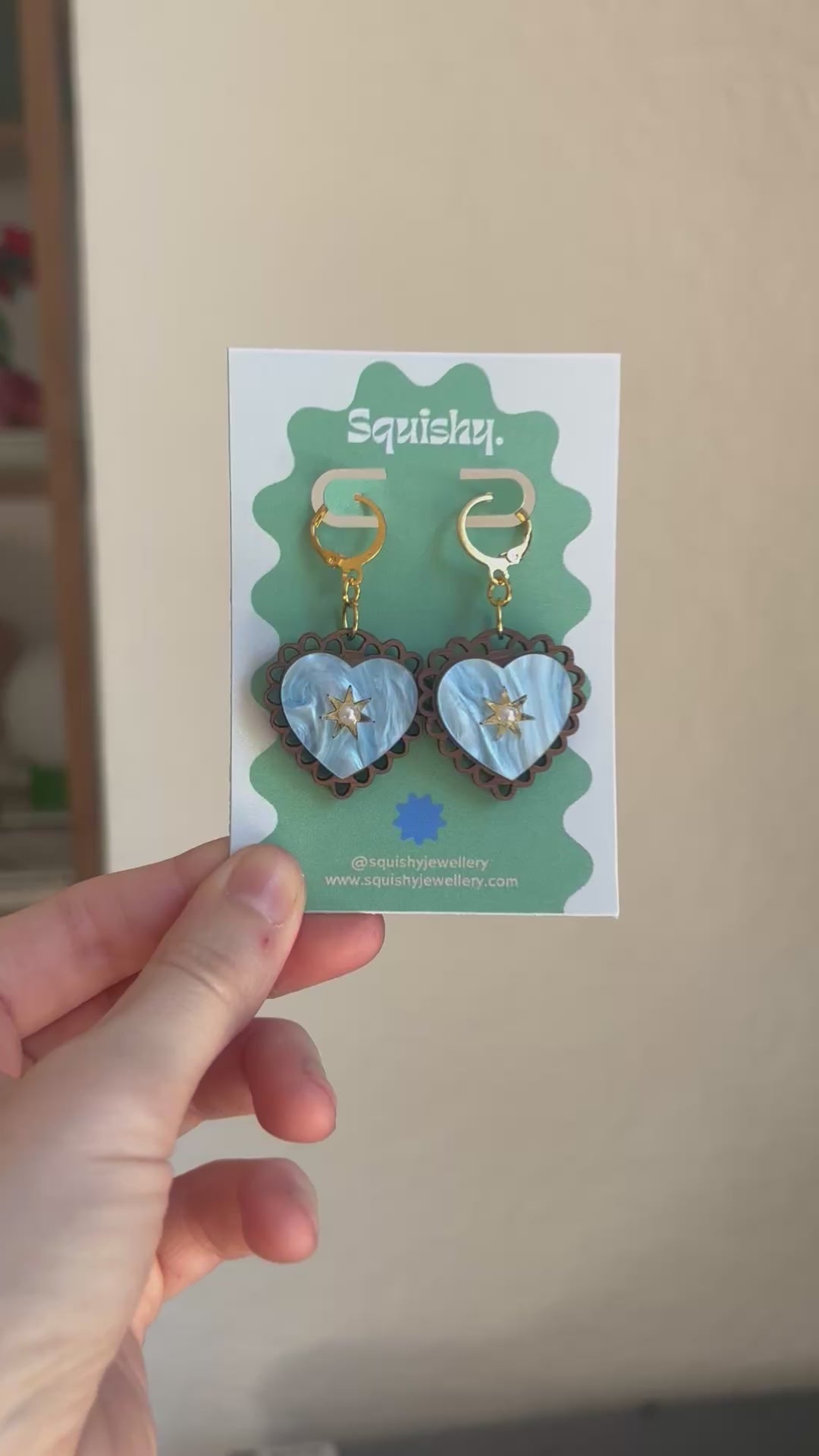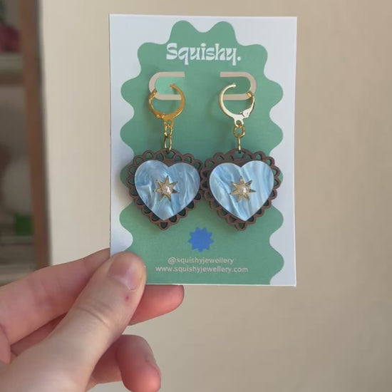 Rococo Blue Heart Earrings with Walnut Backing & Gold Star Detail – Acrylic Hoop Jewellery
