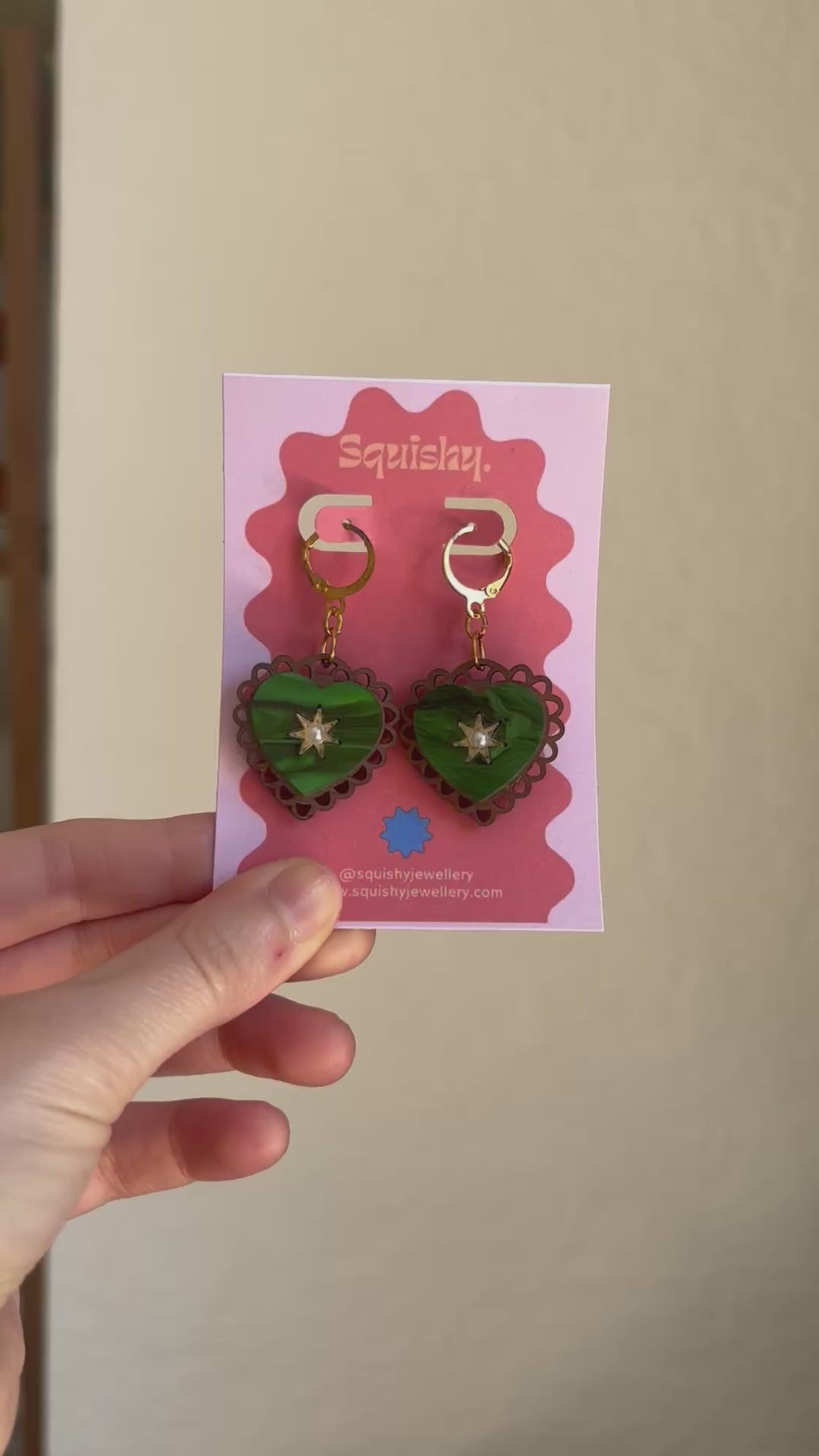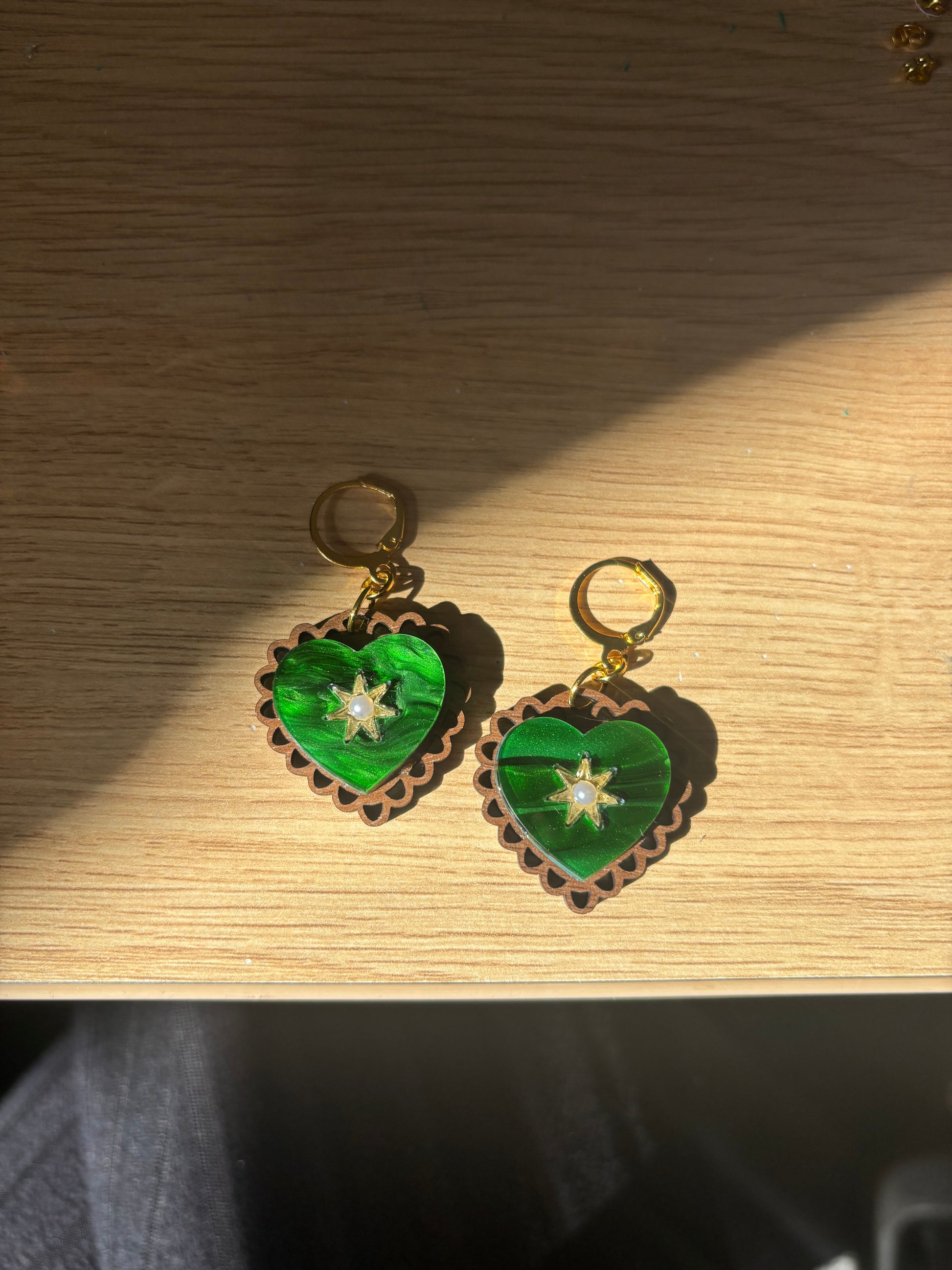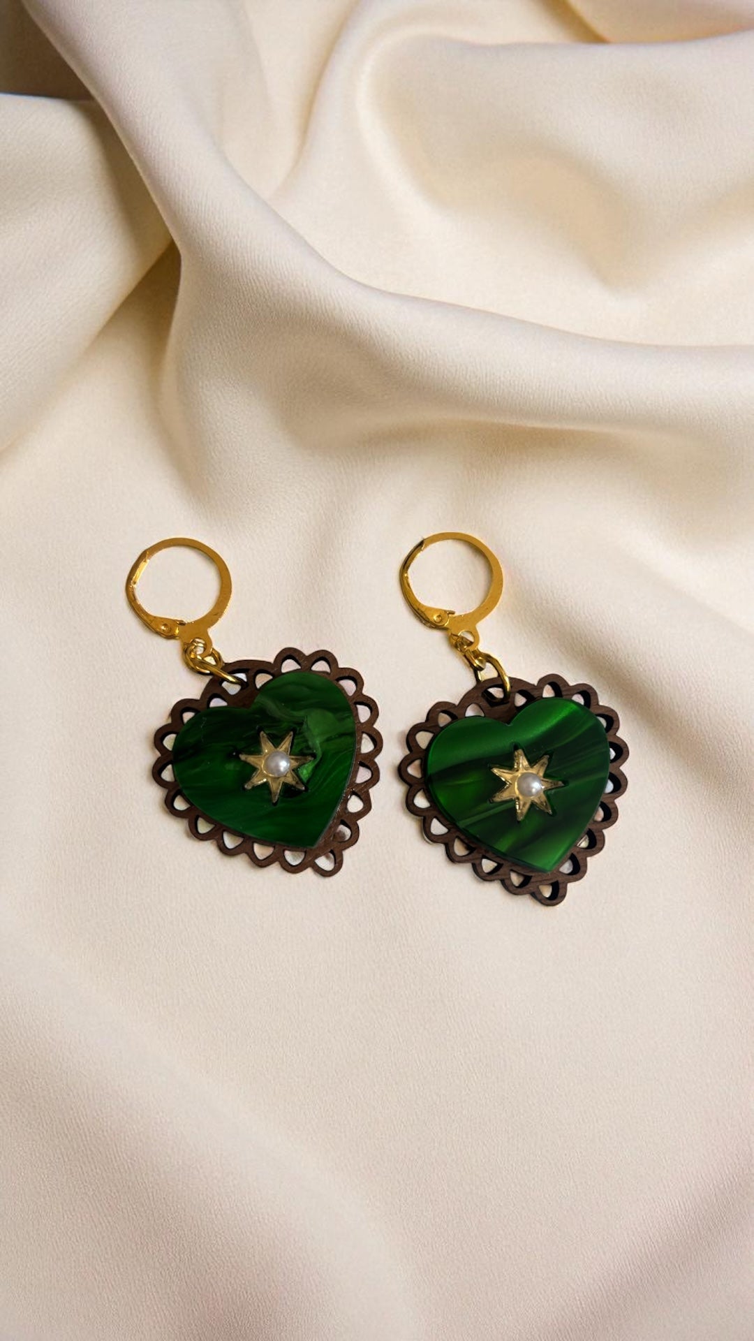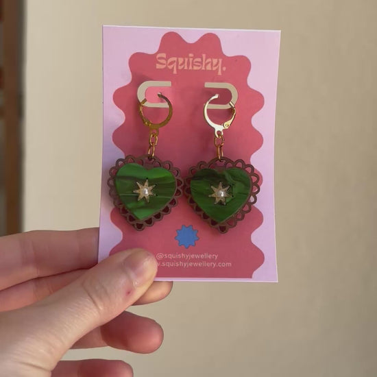 Rococo Green Heart Earrings with Walnut Backing & Gold Star Detail – Acrylic Hoop Jewellery